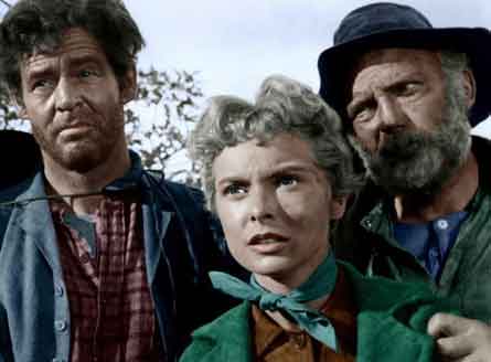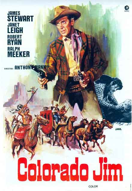 III)- COLORADO JIM (1953)- Aquí el protagonista, Howard Kemp (James Stewart), el más iracundo y agresivo de la serie persigue al forajido Ben Vandergroat (Robert Ryan) por quien se ofrecen cinco mil $ de recompensa. Un anciano buscador de oro (Millard Mitchell) y un militar con dudosa reputación (Ralph Meeker) se unen a él. Capturarán entre los tres a Ben y a su ahijada Lina Pach (Janet Leigt) y decidirán repartirse la recompensa mientras hacen frente a un grupo de indios. Cinco personajes además de los indios, film itinerante (llegar a la civilización y cobrar la recompensa), abierto como siempre en espacios, cerrado sobre los cinco personajes. Aquí el protagonista no actúa por venganza sino para rehacerse de un pasado nada envidiable y por la codicia: Howard Kemp fue a la guerra, perdió a su novia que además de abandonarle con un amigo se quedó con sus tierras. Con la recompensa piensa adquirir tierras nuevas y empezar de nuevo. Es el film más ácido de la serie. Los personajes están admirablemente trazados, delimitados e interpretados con mención especial para Ben Vandergroat/Robert Ryan, un delincuente malvado y sin escrúpulos pero astuto y cínico por lo que fomenta la desunión entre los tres cazadores desconfiados entre si y, conocedor de la historia de Howard, continuamente le recuerda con burla su pasado por lo cual en alguna ocasión es agredido. Lina, situada en medio del conflicto, intenta en un principio defender a su padrino/protector (en realidad hija de un cómplice fallecido). Los indios atacan a causa del repudiado teniente Andersson/Ralph Meeker por haber forzado a una joven india lo cual hace unir al grupo, no por solidaridad sino para sobrevivir. Parece posible llegar a Abilene donde entregarán a Ben y cobrarán la recompensa pero este engaña al anciano Jesse Tate/Millard Mitchel proponiéndole la libertad a cambio de enseñarle la situación de una (falsa) mina de oro, asesinándole poco después hasta que finalmente es abatido por Howard; el teniente perece al intentar recuperar el cadáver de Ben (la recompensa es tanto si se entrega vivo o muerto) y en el último momento Howard no recogerá al difunto pues se ha enamorado de Lina y ella le corresponde (esta secuencia es una profunda reflexión sobre la ambición, la degeneración moral y la final pérdida del egoísmo con la tranquilidad de espíritu y olvido total del pasado); irán a Abilene con el propósito de casarse porqué el auténtico amor es más grande que todas las fortunas del mundo….