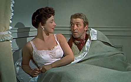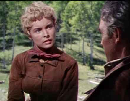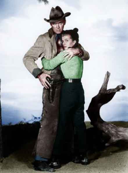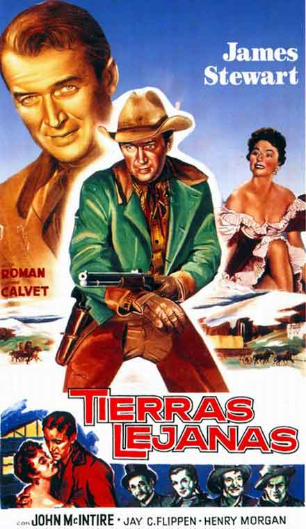 IV)- TIERRAS LEJANAS (1954) Es el regreso de Mann a Universal después de la experiencia de “Colorado Jim” para M.G.M. La situación/el paisaje en esta ocasión es el de Alaska (gran parte del film está rodado en las Montañas Rocosa de Canadá). Aquí nuestro hombre es Jeff Webster (James Stewart) y su principal interés es pasar un ganado propiedad suya, venderlo y ganar el máximo de dinero posible. También algo le sucedió en el pasado (en sueños pronuncia angustiado el nombre de una mujer, ¿una antigua novia?), es el personaje más antipático de los encarnados por Stewart: un egoísta y materialista, al menos en un principio ya que finalmente la muerte de su buen amigo Ben Tatem (Walter Brennan) y la amenaza de los pistoleros sobre el pueblo le despertará la conciencia y actuará como justiciero. Es el film donde las situaciones cómicas y algunos personajes desprenden más humor, como el caso del juez Gannon (John McIntire) quien es el cacique de turno, imponiendo su ley sin dejar que nadie proteste, es a la vez malvado y socarrón con un sentido muy peculiar del humor negro. Aquí Mann subraya un poco más que en el resto de la serie el papel de la mujer. Dos se enamorarán de Jeff: Renée Vallon (Corinne Calvet), una ingenua muchacha franco- canadiense y Ronda Castle (Ruth Roman), de moral ambigua, quien le comprará finalmente el ganado y le contratará para transportarlo a una lejana localidad fuera de la “jurisdicción” de Gannon pero este y sus secuaces acuden para robar ganado y terrenos con el fin de enriquecerse. Ronda morirá por proteger a Jeff antes de que este acabe con el “juez”. Jeff y Renée ya tienen un futuro prometedor ante ellos….. Veamos el diálogo cuando Gannon juzga a Jeff en un saloon: JUEZ: “¿De que se le acusa?” JEFF: “Maté a dos hombres”. JUEZ : “¿Porqué lo hizo?” JEFF: “Conducían mi ganado desde Wyoming y quisieron volverse atrás”. JUEZ: “Estaban en su derecho si querían volverse”. JEFF: “Pero no con mi ganado”. JUEZ: “No creo que les disparara por la espalda. Absuelto” y en otra ocasión dice el JUEZ: “Me cae usted bien, Jeff, lástima que tenga que ahorcarle”….