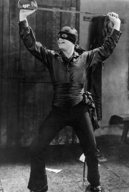 La primera aparición cinematográfica del personaje de Johnston McCulley fue la muda “The Mark of the Zorro” (“La marca del Zorro”, de Fred Niblo (1920) con el mítico Douglas Fairbanks como don Diego de la Vega/Zorro. ¡Justicia para todos! Es el grito del Zorro al acabar de derrotar y ridiculizar a sus enemigos. La cinta se abre con un primer plano de la “Z” grabada en la mejilla de un soldado señal de la lucha contra la opresión y el racismo en California (otro soldado muestra la “Z” marcada por el misterioso enmascarado por haber pegado a un indio). Nadie puede imaginar que el “Zorro” y el afectado y amanerado aristócrata don Diego de la Vega son la misma persona……Gran éxito artístico y comercial (largas colas para ver la película con vigilancia policial para evitar tumultos). “Don Q, Son of Zorro” (“Don Q, Hijo del Zorro”, 1925) es la continuación del film de Niblo interpretado también por Douglas Fairbanks (también productor), aquí como César de la Vega, hijo de don Diego, el Zorro. La cinta ---- no basada directamente en las historias de Johnston McCulley sino en una novela de Hesketh y Cate Prichard, “Don Q´s Love Story”, editada en el mismo año de1925, sobre la cual Lotta Woods elaboró el definitivo guión ---- fue dirigida por Donald Crisp quien obtendrá un Oscar como actor en “Que verde era mi valle” (1941) del gran John Ford. El film resultó de más calidad que el primero y fue el cuarto título más taquillero de 1925.
