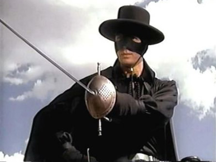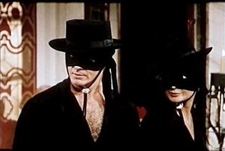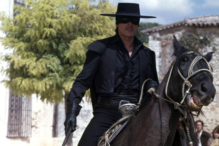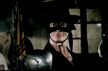 Por supuesto la fiebre llegó a España. En 1961 un Jesús Franco en funciones de ayudante de dirección y guionista encuentra productor y concede la dirección a Joaquín- Luis Romero Marchent. Así nació “La venganza del Zorro”, con Frank Latimore como héroe enmascarado. Su estilo era el de un western (Romero Marchent era ya un realizador experimentado a diferencia de la década anterior cuando filmó los dos “Coyotes”). Su relativo éxito (gustó mucho a los jóvenes) hizo dar una 2ª vuelta al tema: “Cabalgando hacia la muerte” (1962), con Frank Latimore repitiendo de Zorro y con guión de Josep Mallorquí Figueroa, escritor del “Coyote”. Destacaba el oficio y la experiencia de Romero Marchent, director asimismo de unos cuantos westerns, tuvo una serie de críticas favorables y el film logró introducirse en el mercado anglosajón con el título de “The Shadow of the Zorro”, mismo título para la edición italiana, “L’ombra di Zorro” (=”La sombra del Zorro”). Era en realidad la primera de las coproducciones hispano-italianas sobre nuestro personaje. Después vendrán los tres títulos de José- Luis Merino, un artesano más que competente no reconocido del todo, con Charles Quiney como Zorro y la mezcla de figuras dispares y despropósitos de finales de los 60/principios de los 70 a los que fue sometido el personaje (“Eróticas aventuras del Zorro”, “El Zorro contra Maciste”, “El Zorro y los 3 mosqueteros”, etc.). Llegamos a 1974 donde aparece un Zorro para la TV americana, de Don McDougal y protagonizado por un (aún) desconocido Frank Langella que cuatro años después nos dará una notable interpretación en “Drácula”, de John Badham, 1978), desde luego más sencilla y conseguida que la falsamente romántica versión de Francis Ford Coppola (1992). También relativamente destacable es la mediocre “El Zorro” (“El Zorro”, 1975), de Duccio Tessari y protagonizada por Alain Delon, obteniendo un destacable éxito comercial. Los dos últimos, filmados por Martín Campbell, “Mask of the Zorro” (“La máscara del Zorro”, 1998) y “Legend of the Zorro” (“La leyenda del Zorro”, 2005) , con Antonio Banderas y Catherine Zeta Jones, es una mezcla de Joaquín Murrieta y el Zorro, poseyendo los típicos defectos del cine actual de aventuras: recreación de decorados, profusión de efectos especiales, vulgar y cansina interpretación, acción a toda velocidad que marea a los auténticos aficionados al cine, además adolece la existencia de un buen guión. Al menos podemos decir esto del primero; del segundo lo mejor es…..el silencio……