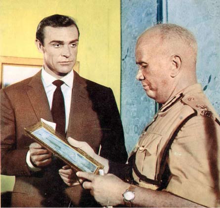 También veremos al agente secreto de la CIA, Félix Leiter, amigo de 007, interpretado en “Dr. No” por Jack Lord, conocido principalmente por la serie televisiva “Hawái 5-0” (cambiará de actor en cada entrega) y a Ursula Andress como Honeychile (Honey, para reducir) Rider, primera Bond-girl, la cual encandiló a mucha parte del público por su belleza y su reducido atuendo. Para el papel del Dr. No pensó Fleming primero en su amigo Noel Coward el cual rechazó la propuesta al no corresponderse con el físico del personaje. El Dr. No era un hombre muy alto, rapado al 0, vestido con kimono y con unas pinzas metálicas en lugar de manos, luego el escritor pensó en su primo, el actor Christopher Lee (famoso por su interpretación de “Drácula”, de Terence Fisher para Hammer, 1958) --- más adelante interpretaría al villano Francisco Scaramanga enfrentado con James Bond/Roger Moore (a quien eclipsaba totalmente) en “El hombre de la pistola de oro”, de Guy Hamilton en 1974) --- hasta finalmente serle concedido el personaje al también actor teatral Joseph Wiseman el cual (aunque no concordante con la descripción física del libro) realizó un trabajo antológico, modelo y patrón para los futuros malvados de la serie (inspirados por el “Dr. Mabuse” y, particularmente en el caso que nos ocupa, en el Dr. Fu-Manchú).