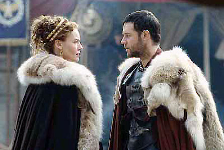 En “Gladiator” se repite la historia de “La caída del Imperio Romano”, podríamos decir que es un remake: después de fallecer Marco- Aurelio (180 d. C.) el general romano Máximo Décimo Meridio (correcto Russell Crowe) pasará a esclavo y gladiador a causa de la persecución de Cómodo (excelente Joaquin Phoenix) ya que el anterior emperador (Richard Harris) no ha dado el poder a su hijo sino a Máximo al que quiere como a tal (en realidad sabemos que Marco Aurelio si quería a su hijo y le dio la jefatura del Imperio, cometiendo así el mayor error de su vida). Cómodo le perseguirá encarnizadamente, asesinará a su esposa e hijo y desea matarle a toda costa. Máximo, enamorado de Lucilla (en ambos films), hermana de Cómodo encabezará la rebelión… Al igual que en “La caída…” el guión hace aguas… La parte íntima está muy bien resuelta con fuelle claramente shakesperiano: envidias, celos, odios; sentimientos de maldad y bondad son el engranaje que mueve la máquina narrativa la cual es motor de la historia. En la parte épica hay de todo: planos demasiado rápidos, los soldados que marchan a un lado y luego está en el otro, hace saltar la cámara sobre su eje repetidas veces consiguiendo el aturdimiento del espectador, imágenes bellas y bien conseguidas que dejan de serlo a base de repetirlas innecesariamente (la escena inicial, p. e. de la mano en el trigo), el ralentí usado como efectismo que prolonga inadecuadamente los “tempo” mientras en plena batalla vemos el orden de combate de las legiones más conseguido que en “La caída…” donde las luchas eran un desconcierto. Con el ordenador ahora es más fácil conseguir una Roma o un Coliseo bajo el lema de la perfección técnica pero también es más impersonal y aséptico… Prefiero los escenarios reales y el entrañable cartón- piedra bien elaborado, no las chapuzas, de antaño. El alargamiento de unos planos y la gratuidad restan puntos a “Gladiator” (en “La caída del Imperio Romano” recuerdo una toma totalmente innecesaria: Marco y Lucilla entran en un templo en plano cenital, o sea perpendicular, filmado desde el techo, algo impensable en un realizador como Mann por lo que pienso en una imposición más del productor).