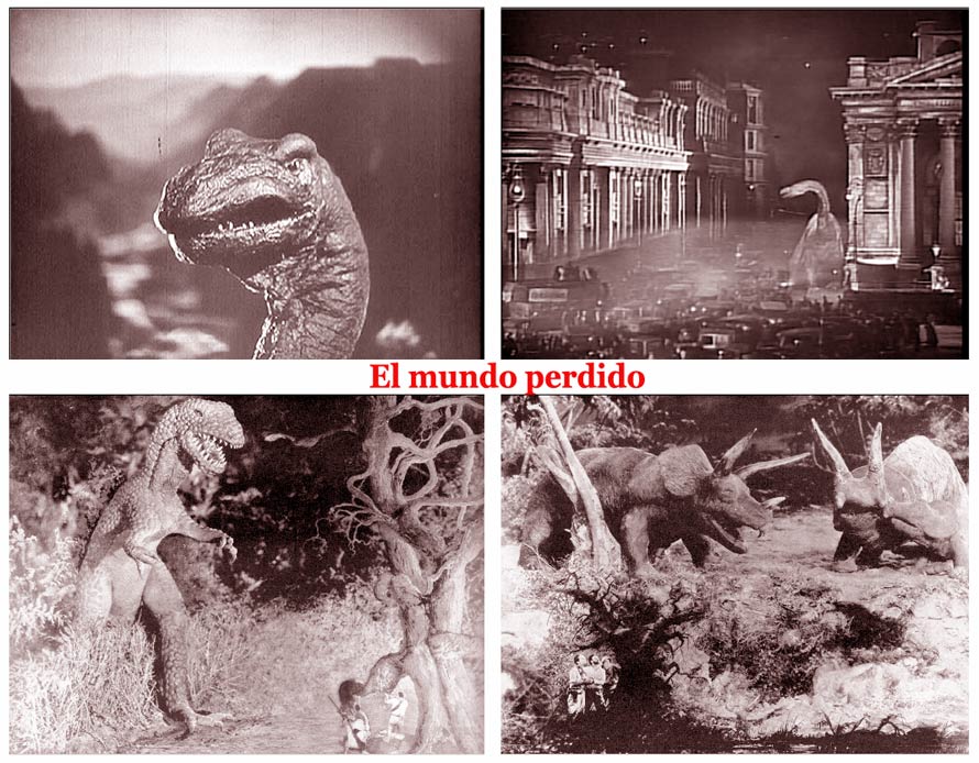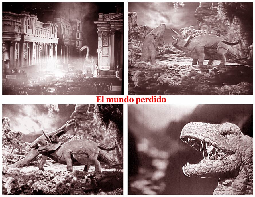 Aquí conseguía O’Bie unas maquetas y una animación aún más perfecta y realista que en sus anteriores logros (ver la evolución profesional de nuestro hombre): esqueletos de acero cubiertos con hojas de goma (usadas en las prótesis dentales) y hule, esponja roja para dar volumen, piel de látex, chocolate de taza para simular sangre en las heridas de los dinosaurios y, además, se introducían válvulas de hinchar balones dando sensación de respirar por parte de los animales. O’Brien combinó perfectamente la acción de personas con dinosaurios en un mismo encuadre, movimiento de cámara (cfr. planos detalle) cuando en trabajos anteriores la cámara estaba fija, ofreciendo despliegue de imágenes mucho más impactantes y emocionantes que antes. Los primeros planos sobre las cabezas de los dinosaurios son impresionantes, con detalles como la saliva saliéndoles de la boca, giro de ojos y respiración. La escena en donde los dinosaurios huyen ante la erupción de un volcán se filmó en una posada de 23 x 46 m y los animales prehistóricos estaban inspirados en los dibujos de Charles R. Kinght del Museo de Historia Nacional. Aparte de Triceratops (herbívoro, prácticamente antecesor del rinoceronte, con una especie de collar protegiéndole la cabeza de los depredadores) Tyranosaurus (el más temido carnívoro), Pteranodon (reptil volador), Allosaurus (parecido al Tyranosaurus) y Stegosaurus (cabeza pequeña, toda la espina dorsal hasta la cola protegida con duras crestas, una cola dura y de golpe mortífero y tres cerebros…) con frecuencia presentes en la ya larga filmografía “dinosaúrica” y el más ocasional --- en el cine que vendrá después--- Brontosaurus, aparecerán también el Agathaumas y el Trachodon. Por vez primera observábamos el movimiento de muchos dinosaurios a la vez en una llanura (lo normal era ver uno o dos, en escena de lucha generalmente, no más), todos con movimiento propio por lo cual es de admirar el trabajo de O’Brien y Delgado. Estos modelos posteriormente se exhibieron en el Museo de Artes y Ciencias de Los Ángeles. Arthur Conan Doyle aparecía como presentador del film original que se perdió tras un incendio en los estudios (circulaba una copia con metraje reducido para colegios pero hace algunos años, gracias a la Filmoteca Checa, podemos disfrutar de una versión más completa, la distribuida en circuito DVD). “El mundo perdido” gozó también de un buen reparto: Wallace Beery (profesor Challenger), Lewis Stone (sir John Roxton), Lloyd Hughes (Edward Malone) y Bessie Love (Paula White). La trama, más adelante estereotipada, se centra en una expedición a una región rodeada/protegida por montañas donde la vida aún es prehistórica en su fauna y flora (dinosaurios, cavernícolas) situada en una inexplorada y casi inaccesible región del Brasil. También se repetirá la captura de uno de los animales (el herbívoro Brontosaurus) para llevarlo a Londres y poder demostrar Challenger sus teorías que posteriormente escapa, derrumba paredes, amenaza con aplastar humanos y finalmente su peso hunde un puente sobre el Támesis y el animal se aleja a nado para volver a su lugar de origen (lo mismo hará King- Kong en Nueva York pero en su caso la bestia encontrará la muerte a causa de su amor por una mujer).