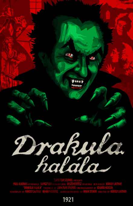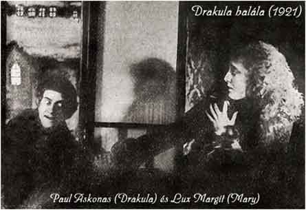DRAKULA HALÁLA. Año: 1921. Hungría, Austria y Francia. Director: Károly Lajthay. Guión: Michael Curtiz (no acreditado) y Károly Lajthay, basado en la novela de Bram Stoker. Director de fotografía: Eduard Hoesch. Intérpretes. Paul Askonas (Drakula), Carl Goetz (Funnyman) Károly Hatvani, Anna Marie Hegener, Aladár Ihász (su ayudante), Paula Kende, Dezsö Kertész (George), Margit Lux, Lene Myl (Mary Land), Oszkár Perczel, Lajos Réthey (El falso doctor), Magda Sonja, Lajos Szalkai, Elemér Thury (Doctor), Béla Tímár.