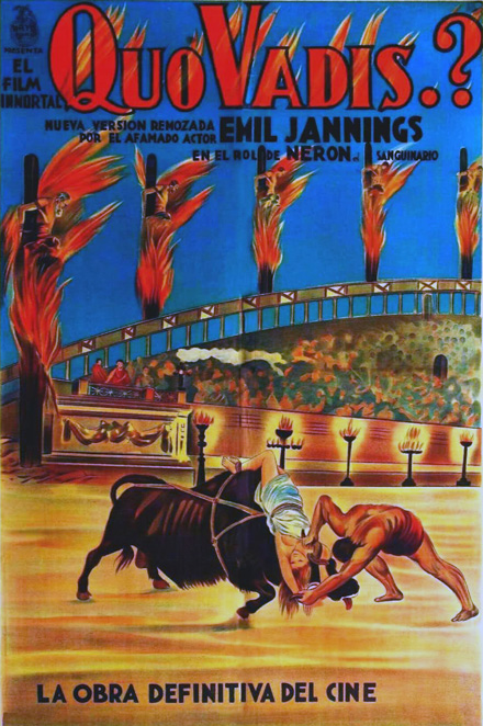 Quo Vadis? Nacionalidad: Italia. Año: 1925. Dirigida por Gabriellino D'Annunzio y Georg Jacoby. Reparto: Emil Jannings (Neron), Elena Sangro (Popea), Rina De Liguoro (Eunica), Lillian Hall-Davis (Licia), Andrea Habay (Petronius), Raimondo Van Riel (Tigellinus), Gildo Bocci (Vittelius), Gino Viotti (Chilone Chilonides), Alphons Fryland (Vinicius), Bruto Castellani (Ursus), Elga Brink (Domittila), Arnold Kent (guardia romano), Marcella Sabbatini (chica), Lucia Zanussi), Guión: Gabriellino D'Annunzio y Georg Jacoby, basado en la novela de Henryk Sienkiewicz. Productor: Arturo Ambrosio. Partitura original: Cecil Copping. Fotografía: Curt Courant, Alfredo Donelli, Giovanni Vitrotti. Decorados: R. Ferro y G. Spellani. Vestuario: Armando Brasini.Productora: Unione Cinematografica Italiana. Duración: 90 minutos. Género: peplum.
