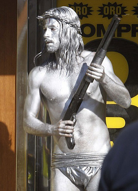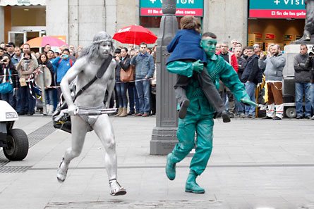 La acción se inicia en la Puerta del Sol madrileña, en el llamado Kilómetro Cero, en donde unas falsas figuras vivientes (un cristo y un soldado verde) intentan atracar un comercio de compra de oro.