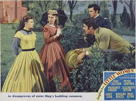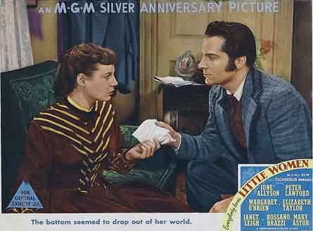 MUJERCITAS. Título original: Little Women. Año: 1949. País: Estados Unidos. Director: Mervyn LeRoy. Reparto: June Allyson, Elizabeth Taylor, Peter Lawford, Janet Leigh, Margaret O'Brien, Mary Astor, Lucile Watson, C. Aubrey Smith, Leon Ames, Rossano Brazzi. Guión: Victor Heerman, Sarah Y. Mason, Andrew Solt (Basado en la novela Mujercitas de Louisa May Alcott). Música: Adolph Deutsch. Fotografía: Robert H. Planck, Charles Edgar Schoenbaum. Productora: Metro-Goldwyn-Mayer (MGM) / Loew's. Duración: 121 min. Género: Drama.
