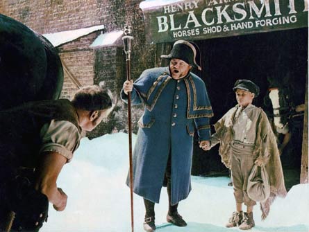 El de la película que nos ocupa vive obsesionado por la vejez, el miedo a verse un día desamparado e indefenso ante la sociedad convirtiéndose en un estorbo para todo el mundo. Carol Reed lo humaniza, incluso es simpático y trata de evitar la violencia de Bill Sikes contra el pobre infante