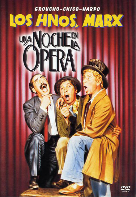 UNA NOCHE EN LA ÓPERA. Título original: A Night at the Opera. Año: 1935.País: Estados Unidos. Director: Sam Wood. Reparto: Groucho Marx (Otis B. Driftwood), Chico Marx (Fiorello), Harpo Marx (Tomasso), Kitty Carlisle (Rosa), Allan Jones (Ricardo), Walter Woolf King (Lassparri), Sig Ruman (Gottlieb), Margaret Dumont (Mrs. Claypool), Edward Keane (Capitán), Robert Emmett O'Connor (Henderson), Billy Gilbert (músico en barco), Enrique Acosta (invitado fiesta), Harry Allen (Doorman), Sam Appel (Dungeon Guard), King Baggot (dignatario), Marion Bell (cantante), Edna Bennett (Maid ), Stanley Blystone (oficial del barco), Al Bridge (inspector de inmigración). Guión: George S. Kaurman, Morrie Rysking, Buster Keaton. Música: Herbert Stothart.Fotografía: Merrit B. Gerstad (B&W). Metro-Goldwyn-Mayer. Duración: 94 minutos.Comedia. Ópera