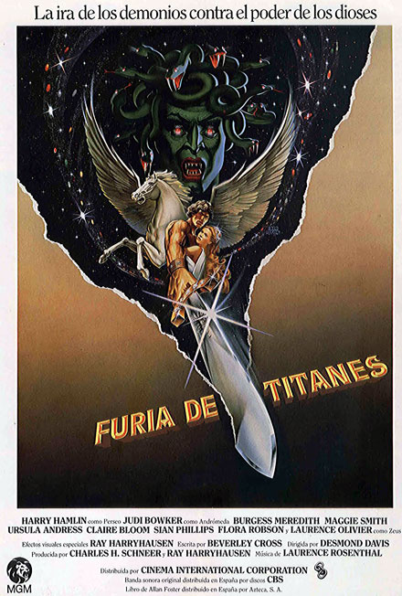 FURIA DE TITANES. Título original: Clash of the Titans. Año: 1981. País: Reino Unido. Director: Desmond Davis. Reparto: Laurence Olivier (Zeus), Claire Bloom (Hera), Maggie Smith (Thetis), Ursula Andress (Aphrodite), Jack Gwillim (Poseidon), Susan Fleetwood (Athena), Pat Roach (Hephaestus), Harry Hamlin (Perseus), Judi Bowker (Andromeda), Burgess Meredith (Ammon), Siân Phillips (Cassiopeia), Flora Robson (Bruja estigia), Anna Manahan (Bruja estigia), Freda Jackson (Bruja estigia), Tim Pigott-Smith (Thallo). Guión: Beverly Cross. Productores: Charles H. Schneer, Ray Harryhausen. Efectos especiales: Ray Harryhausen. Máscaras: Colin Arthur.Música: Laurence Rosenthal. Fotografía: Ted Moore. Metro-Goldwyn-Mayer (MGM). Duración: 118 minutos. Fantástico. Aventuras. Mitología. Antigua Grecia.