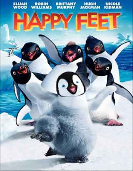A la izquierda cartel de Happy Feet, rompiendo el hielo, en la que dobló la voz del personaje principal, un pingüino que baila claqué. Ha repetido personaje en la segunda parte; Happy Feet 2: el pingüino.